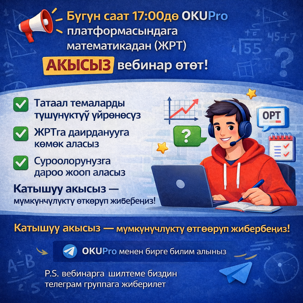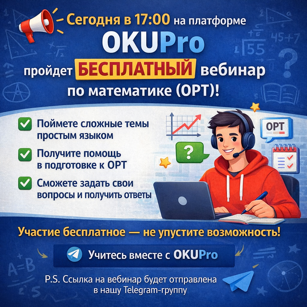 📢 Сегодня в 17:00 на платформе OKUPro пройдет БЕСПЛАТНЫЙ вебинар по математике (ОРТ)!