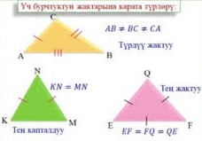 - Ар кандай жактуу үч бурчтук: Үч жагынын тең узундугу ар башка болот. Демек, үч бурчтуктун бардык бурчтары да ар кандай болот.