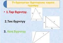 - Кең бурчтуу үч бурчтук: Бир бурчу кең, б.а. 90 тан чоң.